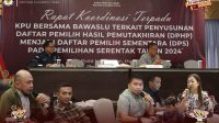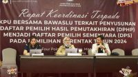 Manado, koranmanadonews.com-Rapat Koordinasi Terpadu antara Komisi Pemilihan Umum (KPU) Sulawesi Utara (Sulut) dan Badan Pengawas Pemilu (Bawaslu) Sulut bertempat di Four Points by Sheraton Manado. Rapat ini bertujuan untuk mempersiapkan tahapan penyusunan Daftar Pemilih Hasil Pemutakhiran (DPHP) menjadi Daftar Pemilih Sementara (DPS) untuk Pemilihan Serentak Tahun 2024 yang berlangsung mulai tanggal 27 hingga 29 Juli 2024.