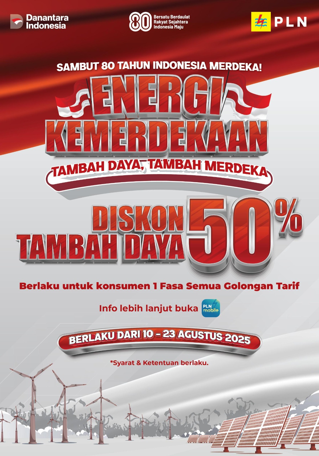 Koran Manado News – PT PLN (Persero) Unit Induk Distribusi Sulawesi Utara, Tengah, dan Gorontalo (UID Suluttenggo) mengumumkan bahwa 2.090 pelanggan telah berhasil memanfaatkan promo tambah daya listrik dengan diskon 50% melalui program “Energi Kemerdekaan, Tambah Daya Tambah Merdeka”. Promo yang berlangsung sejak 10 Agustus 2025 hingga 23 Agustus 2025, ini artinya hanya tersisa 1 hari lagi masyarakat bisa menikmati promo tambah daya ini.