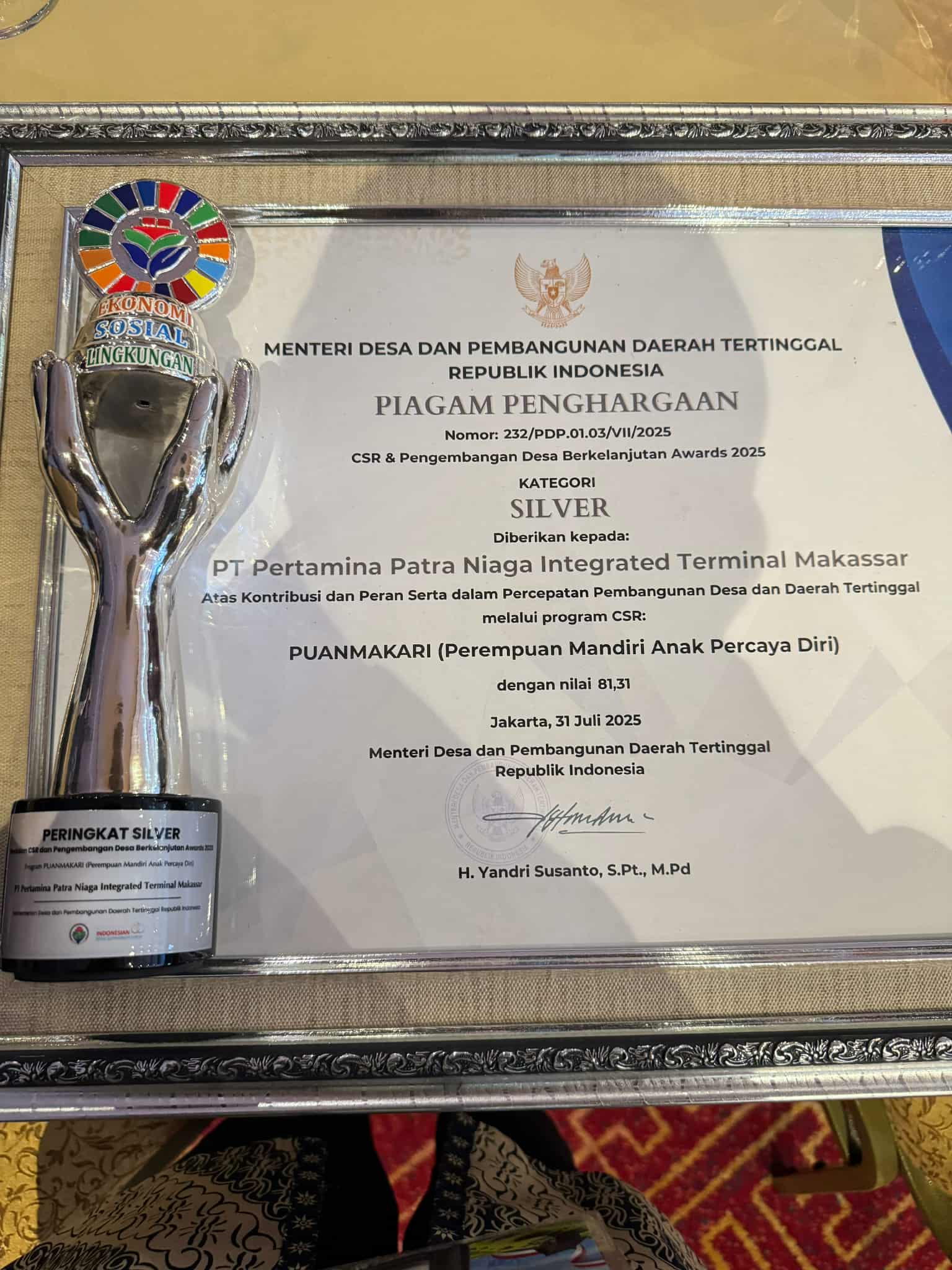 “Penghargaan ini menjadi bukti bahwa PUANMAKARI memberikan dampak nyata dan berkelanjutan bagi masyarakat, khususnya perempuan dan anak-anak. Pertamina berkomitmen untuk terus mendukung pemberdayaan masyarakat agar lebih mandiri, produktif, dan berdaya saing,” ujar Utomo Dhanu Saputra, Integrated Terminal Manager Makassar.