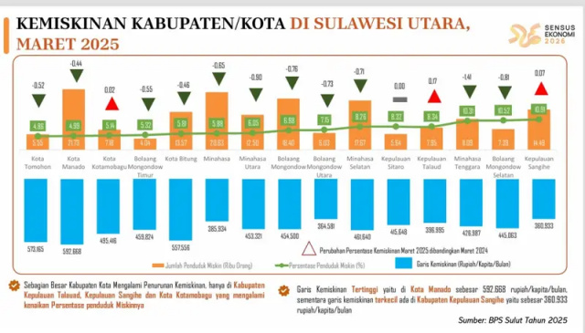 Data BPS Provinsi Sulawesi Utara menunjukkan bahwa pada Maret 2025, persentase penduduk miskin di Sulut mencapai 6,71 persen, dengan garis kemiskinan sebesar Rp 530.304 per kapita per bulan. Tren positif di Kota Manado turut berkontribusi terhadap penurunan angka kemiskinan ekstrem di tingkat provinsi yang rata-ratanya turun 0,43 persen.