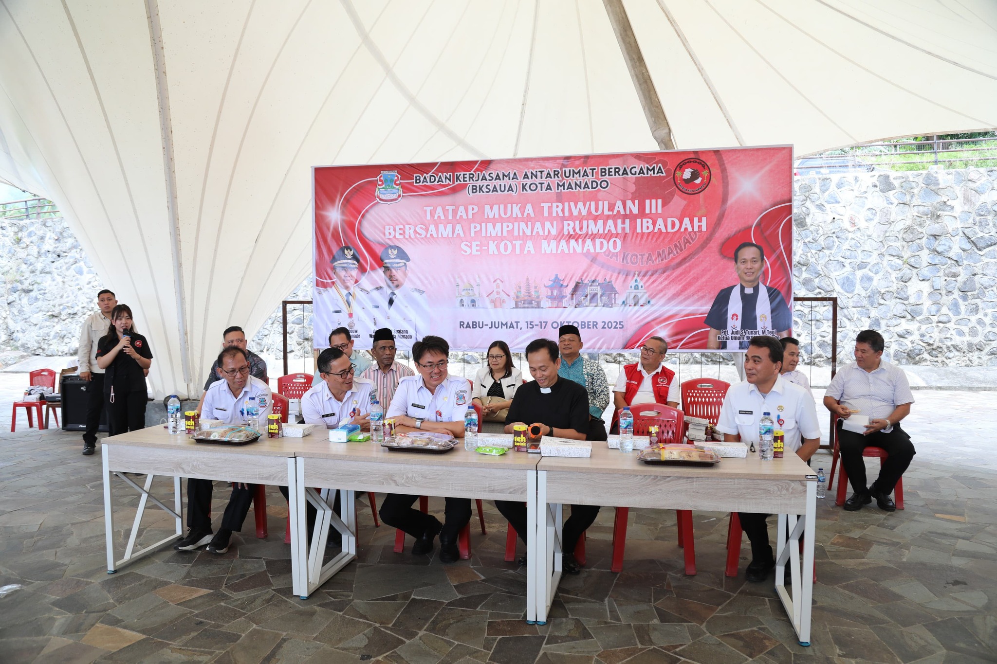 Koran Manado News- Wali Kota menghadiri kegiatan Tatap Muka Triwulan III gengan Tokoh Masyarakat dan Pimpinan Rumah Ibadah se Kota Manado. Kegiatan yang diprakarsai oleh Bagian Kesra Kota Manado dan Presidium BKSAUA Kota Manado ini dilaksanakan di Pasar Wisata Tematik Bunaken di Tongkaina, Rabu,(15/10/2025).