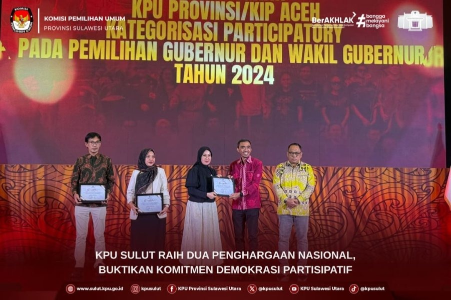 KPU Sulut meraih dua kategori penghargaan sekaligus, yakni kategori Provinsi dengan Kategorisasi Participatory pada Pemilihan Gubernur dan Wakil Gubernur Tahun 2024 serta penghargaan sebagai Provinsi yang Telah Mendokumentasikan Pembelajaran Pilkada Tahun 2024.