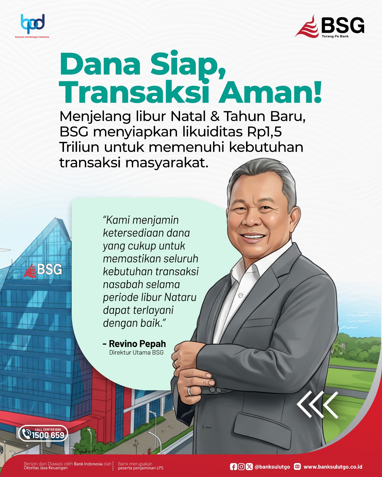 Selain itu,BSG juga memastikan layanan kantor akan beroperasi normal di luar hari libur nasional. Untuk memberikan kemudahan akses di akhir pekan, Pepah menjelaskan bahwa layanan Weekend Banking di Manado Town Square (Mantos) akan tetap beroperasi pada hari Sabtu, 27 Desember 2025, dengan jam layanan seperti biasa.