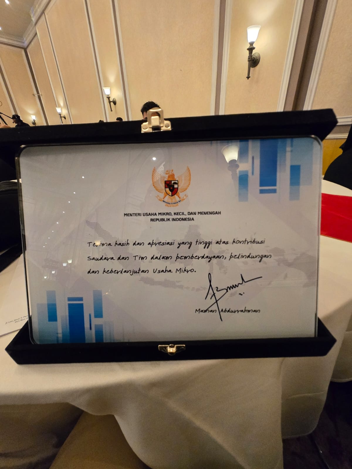 Piagam yang ditandatangani langsung oleh Menteri UMKM, Maman Abdurrahman, diserahkan dalam acara “Anugerah Mitra Usaha Mikro 2025” yang berlangsung pada Rabu, 17 Desember 2025, di Menara Peninsula Hotel, Jakarta.