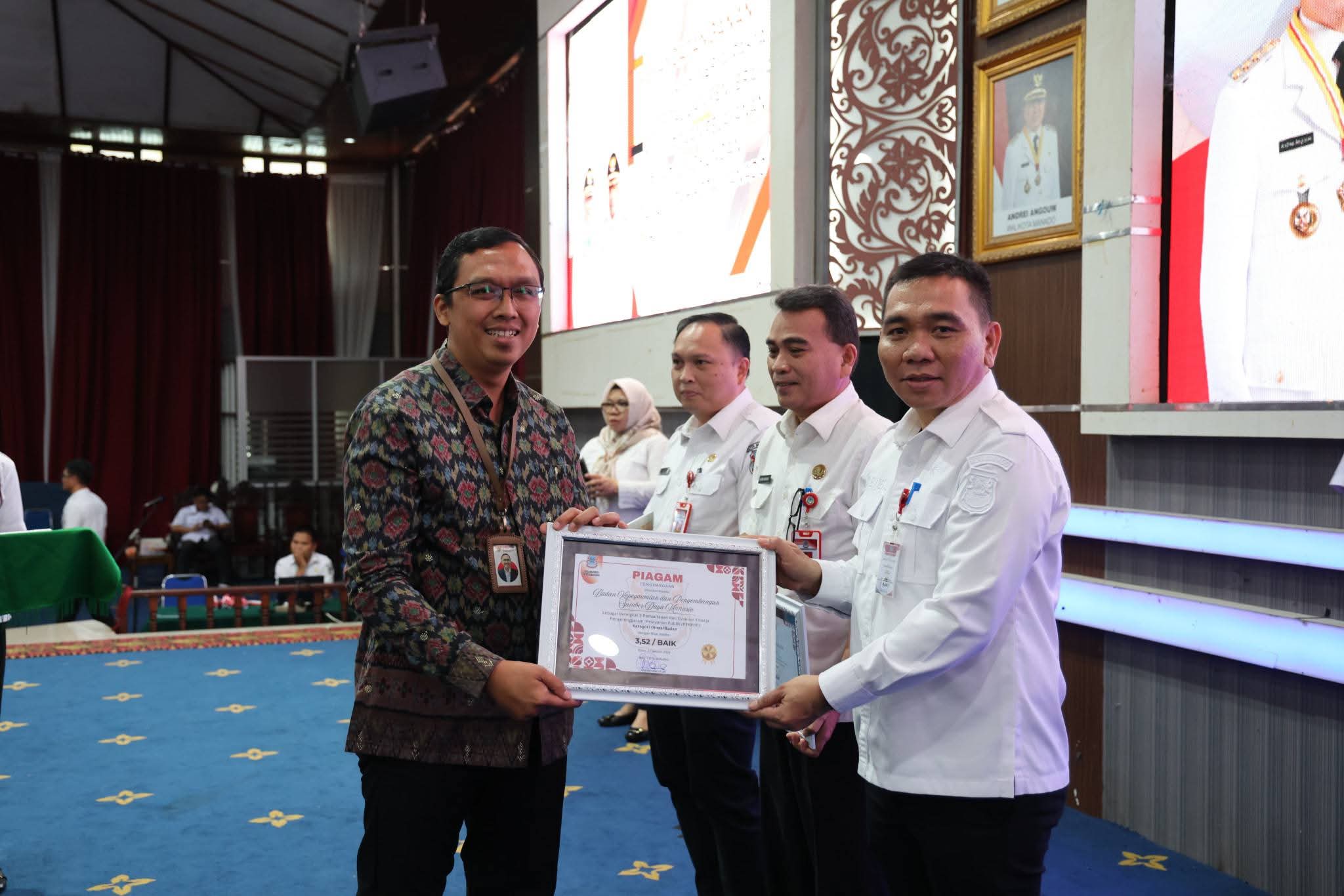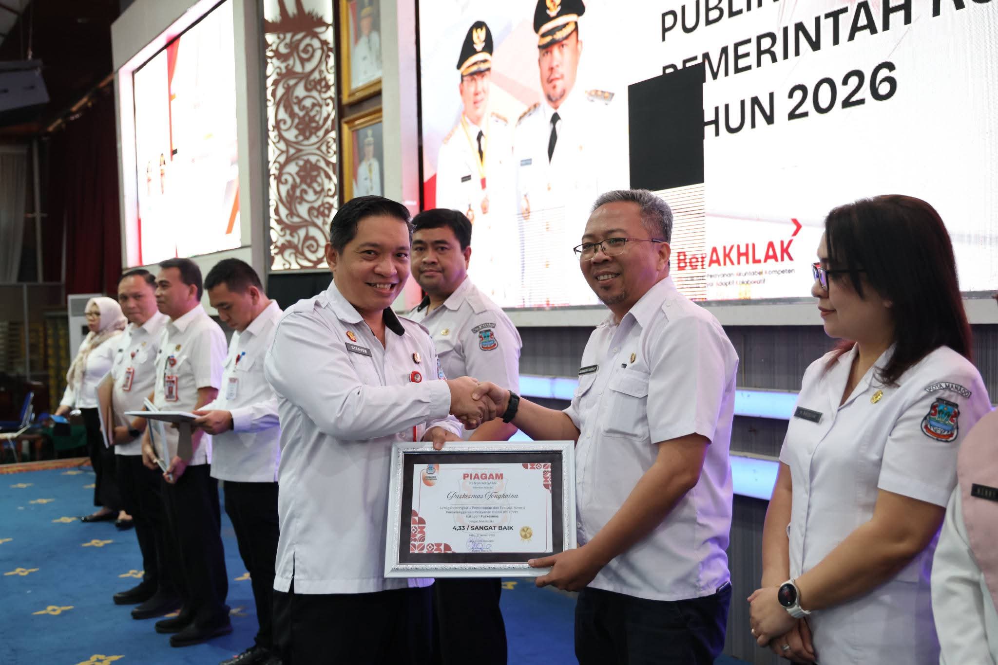 Acara dilanjutkan dengan Penyerahan Penghargaan Pelayanan Publik di Lingkungan Pemerintah Kota Manado yakni; untuk Puskesmas, peringkat Tiga Puskesmas Bailang dan Puskesmas Winangun, peringkat dua Puskesmas Kombos dan Peringkat pertama Puskesmas Tongkaina. Kategori Kecamatan peringkat Dua Kecamatan Wenang, peringkat pertama Kecamatan Paal Dua. Kategori Dinas Badan peringkat III Badan BKP SDM, peringkat Dua Dinas Perindag dan peringkat Satu Badan Perencaan Riset.