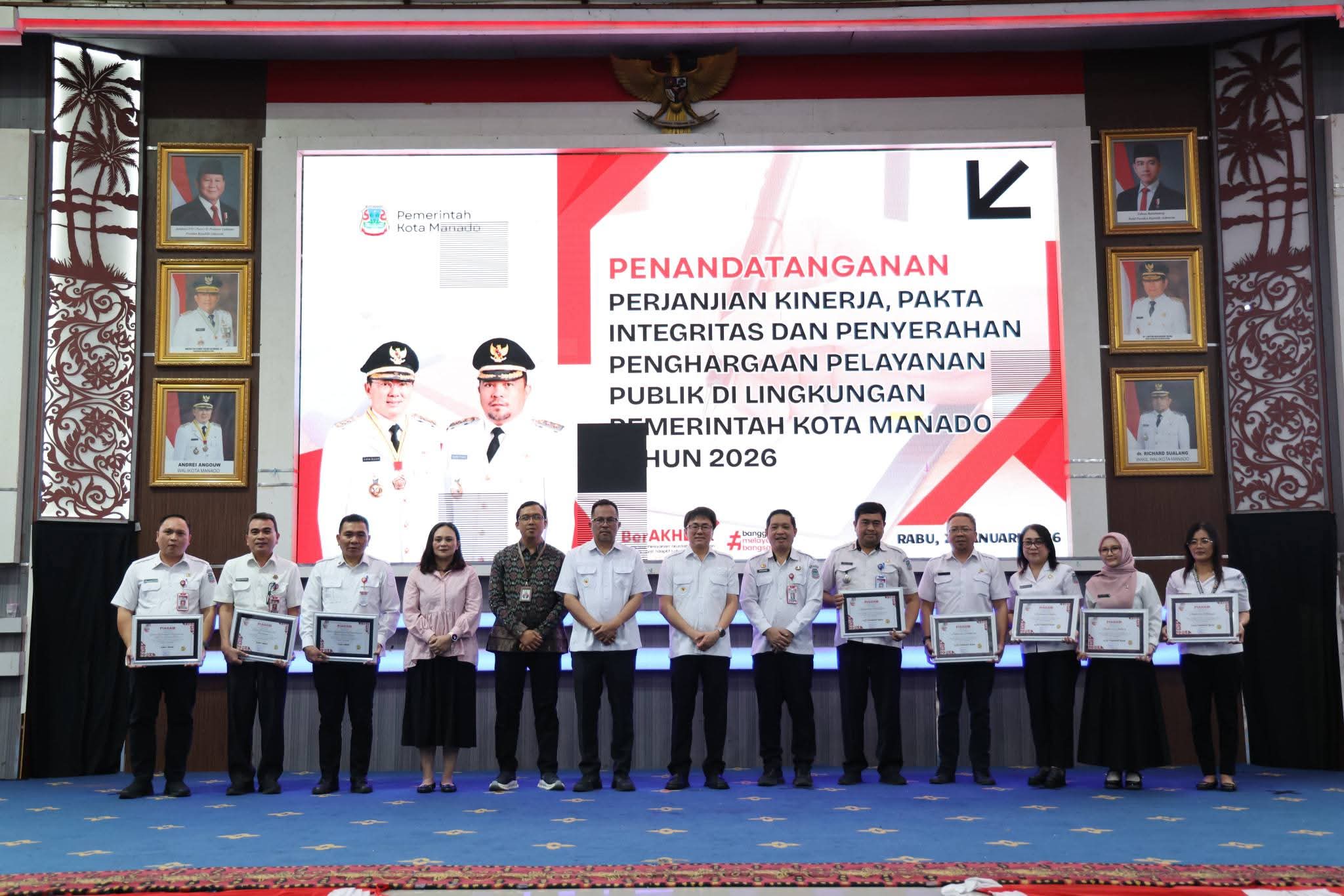 Koran Manado News-Wali Kota Manado Andrei Angouw dan Wakil Wali Kota dr. Richard Sualang menghadiri acara Penandatanganan Perjanjian Kinerja, Pakta Integritas dan Penyerahan Penghargaan Pelayanan Publik di Lingkungan Pemerintah Kota (Pemkot) Manado Tahun 2026. Kegiatan yang dilaksanakan di Aula Serbaguna Kantor Wali Kota ini dihadiri Asisten Deputi II Kementrian PANRB Muhammad Yusuf Kurniawan S.H.,M.Si, Kepala Ombudsmen Manado, Sekot Manado dr. Steaven Dandel M.Ph beserta jajaran asisten dan Kepala SKPD, Para Camat dan pejabat eselon lainnya.
