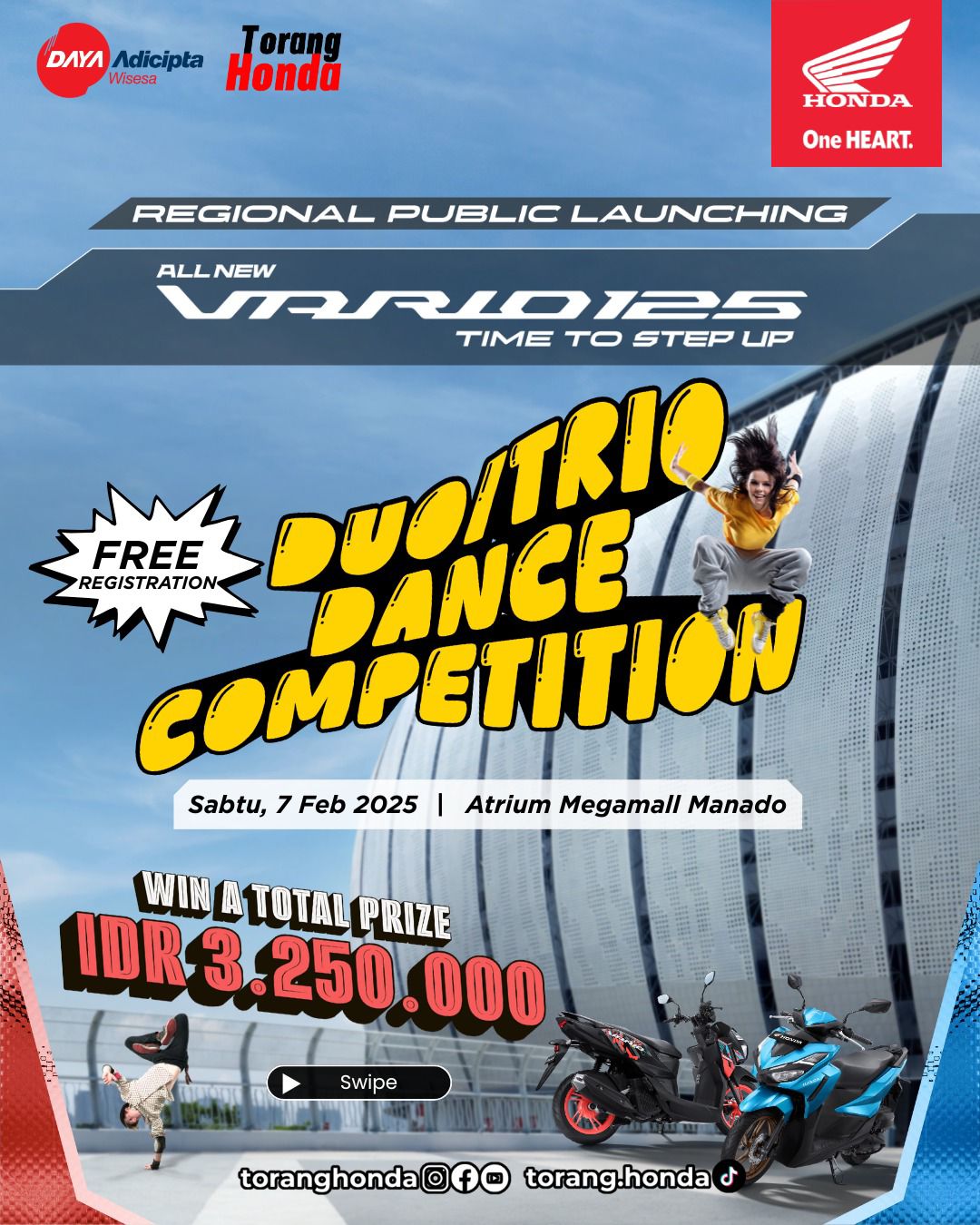 Koran Manado News – PT Daya Adicipta Wisesa (DAW) selaku Main Dealer Honda wilayah Sulawesi Utara, Gorontalo, dan Maluku Utara mengajak masyarakat untuk turut memeriahkan Regional Public Launching New Honda Vario 125 yang akan digelar pada 7 Februari 2026 di Atrium Megamall Manado.