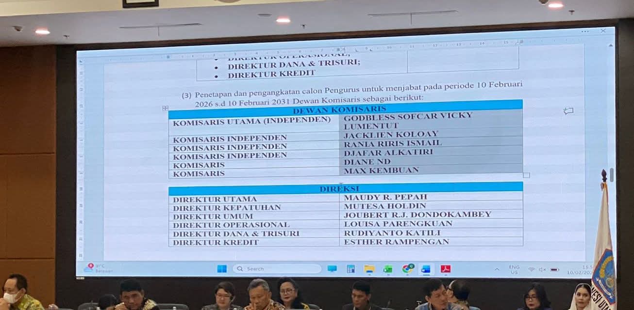 RUPS yang dipimpin Gubernur Sulut Mayjen TNI purn Yulius Selvanus SE sebagai pemegang saham pengendali dan PT Mega Corpora, akhirnya menetapkan kepengurusan PT Bank SulutGo, yaitu jajaran komisaris dan direksi periode 2026-2031.